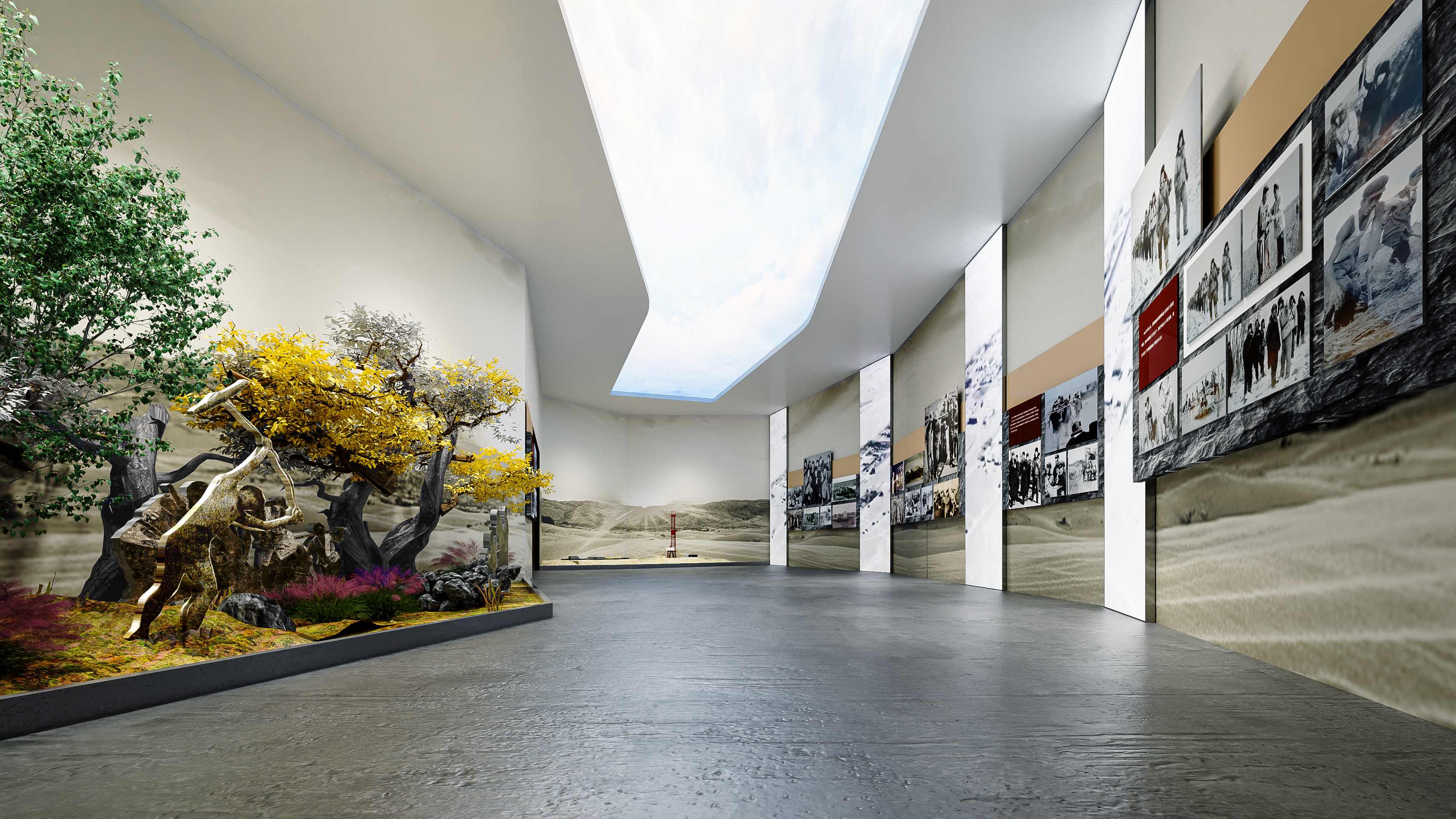 该文化纪念馆是以特种工程兵开山劈石的气势贯穿展厅整体平面布局的设计,通过沉浸空间,全方面立体呈现特种工程兵进戈壁、翻雪山、平泥泽、战苦寒,以集体智慧与不屈精神,为“两弹一星”工程造窝,奠定强国基石的光荣历史。